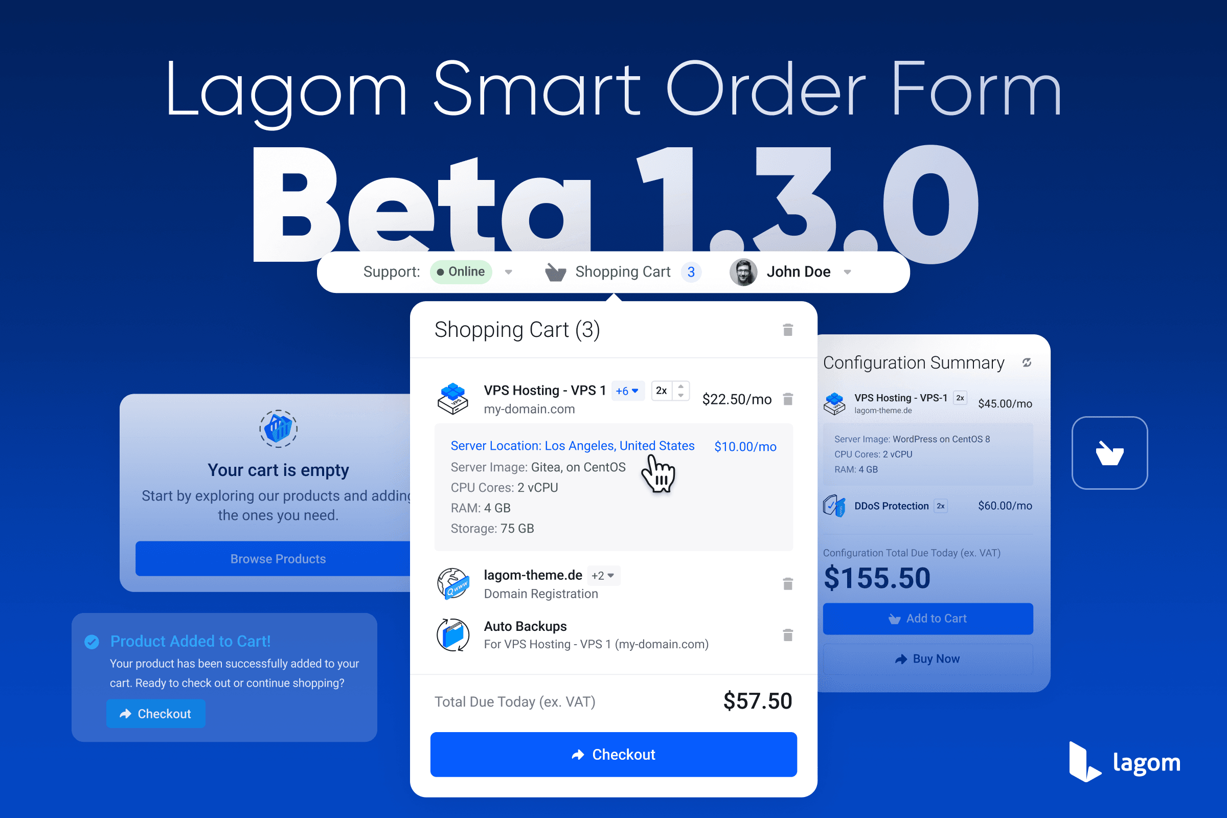With beta version 1.3.0, Lagom Smart Order Form introduces one clear and modern approach: Multi Product Ordering with View Cart always enabled. Customers can now freely configure and add multiple products, services, or domains in one continuous flow. The checkout happens only when the entire order is complete, exactly when the user is ready. This feels natural, familiar, and fully consistent with how ordering works, while still preserving the speed and simplicity that Lagom One Step Order is known for.